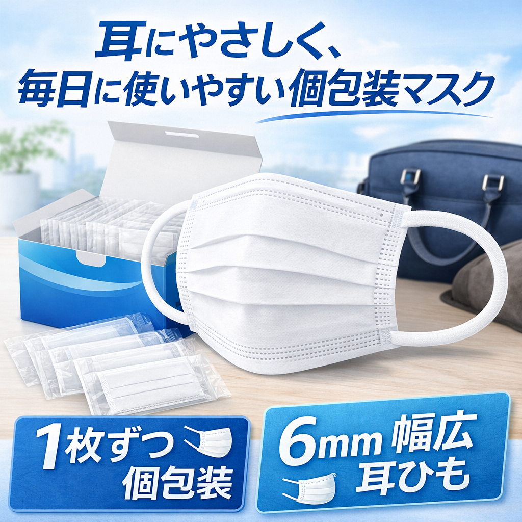高機能マスク 個包装 耳にやさしい 6mm 極幅耳紐 不織布マスク 36箱×40枚